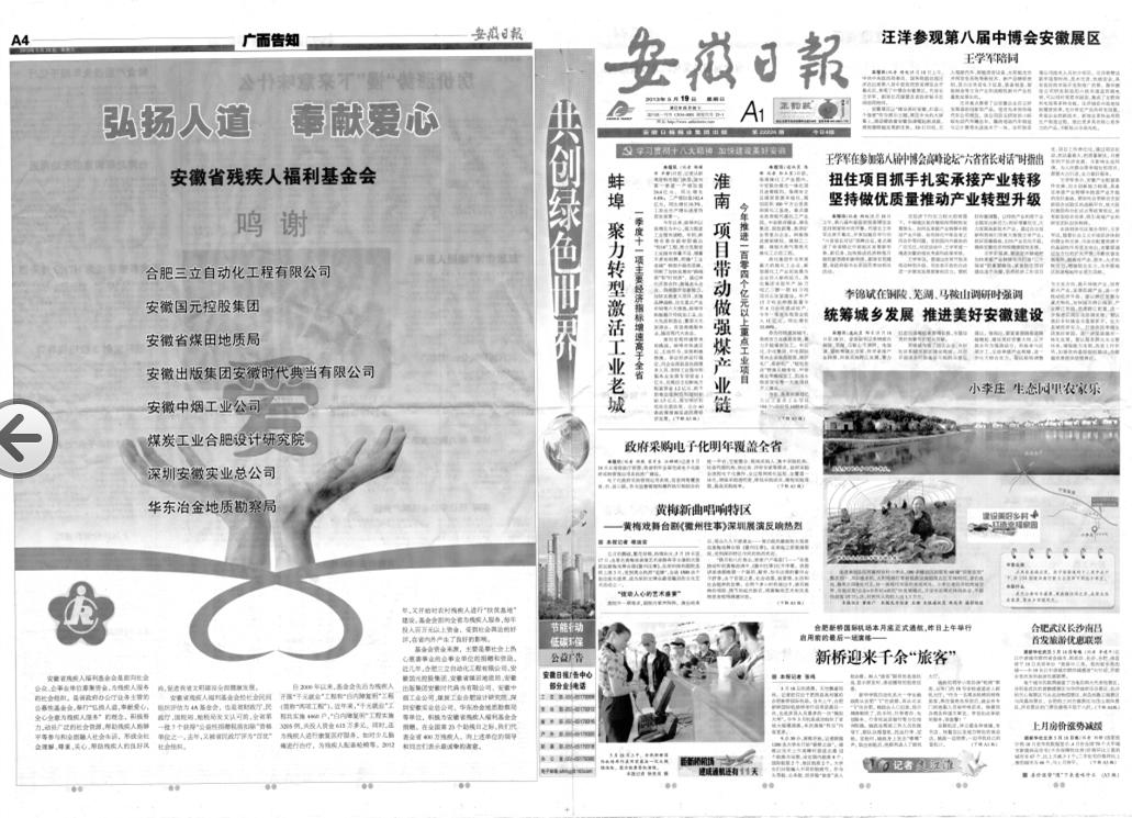 圖為安徽省殘疾人福利基金會(huì)于5月19日在安徽日?qǐng)?bào)上對(duì)我公司的鳴謝