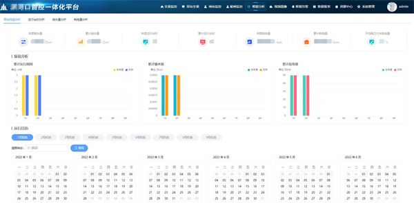 通過運(yùn)行效益分析,直觀展示泵站、船閘的效益情況,主要包括平均每平方水耗電量、抽水量、運(yùn)行臺(tái)時(shí)、耗電量、棄水量等概覽信息,以及歷史分析信息和運(yùn)行日程信息,為泵站/船閘經(jīng)濟(jì)運(yùn)行提供參考依據(jù)。