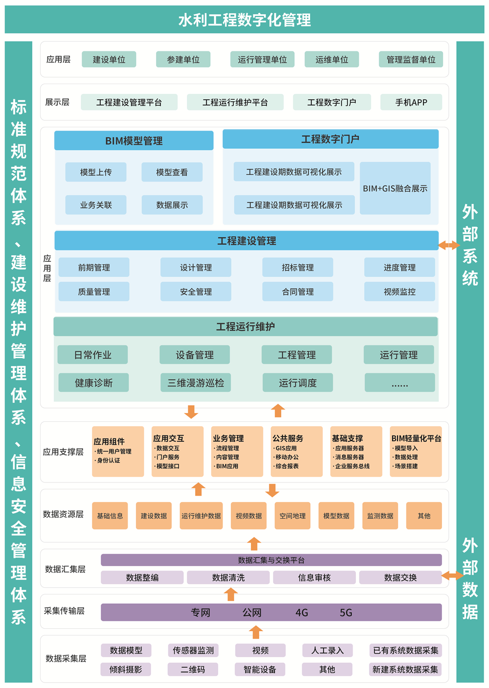 水利工程建設(shè)數(shù)字化管理平臺是以工程建設(shè)管理為和核心,把水利工程建設(shè)全過程主要環(huán)節(jié)如質(zhì)量、安全、進(jìn)度、合同等的流程、數(shù)據(jù)通過數(shù)字化模型進(jìn)行可視化展示和數(shù)據(jù)傳承,為行業(yè)主管單位、項目法人以及各參建單位之間搭建一個統(tǒng)一的工作平臺。該平臺利用了當(dāng)前前沿的數(shù)字技術(shù),如BIM建模技術(shù)等,通過使用數(shù)字模型,有效集成項目設(shè)計、施工、運(yùn)維全階段所產(chǎn)生的數(shù)據(jù)信息,提升信息傳遞效率、降低數(shù)據(jù)利用損失,從而提升工程建設(shè)質(zhì)量、安全水平。