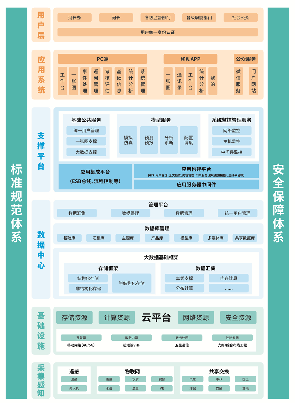 應(yīng)用系統(tǒng)層:主要建設(shè)河長制管理系統(tǒng)、移動APP、微信服務(wù)、門戶網(wǎng)站等內(nèi)容。