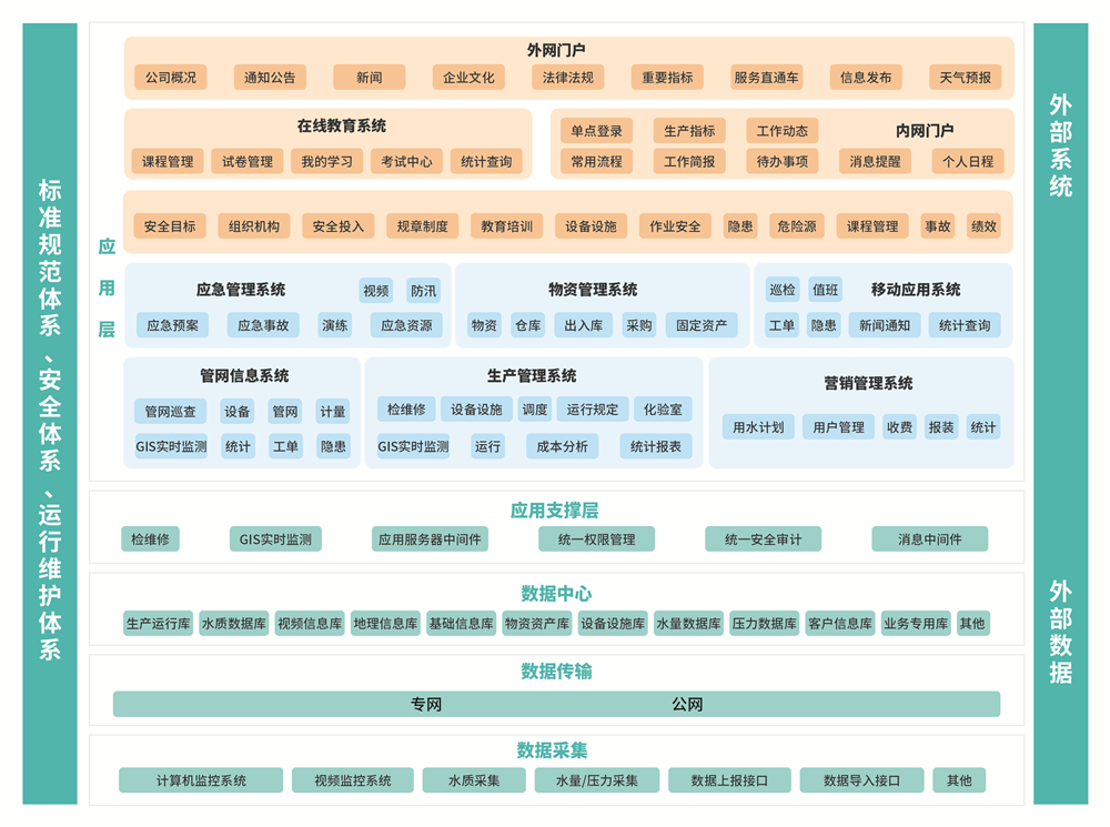 以“互聯(lián)網(wǎng)+水務(wù)”為設(shè)計(jì)理念,構(gòu)建適合水務(wù)科學(xué)化運(yùn)營(yíng)管理的“智能管控、智慧決策、隨需應(yīng)變”的統(tǒng)一的信息化服務(wù)平臺(tái),該平臺(tái)具備功能是:在統(tǒng)一的安全服務(wù)和運(yùn)行維護(hù)保障支撐下,建設(shè)統(tǒng)一水務(wù)信息資源服務(wù),可擴(kuò)展的應(yīng)用服務(wù)集成開(kāi)發(fā)平臺(tái),以及基于GIS的大數(shù)據(jù)可視化管理系統(tǒng)平臺(tái),可實(shí)現(xiàn)生產(chǎn)運(yùn)行遠(yuǎn)程調(diào)度、智能管控和智慧決策。